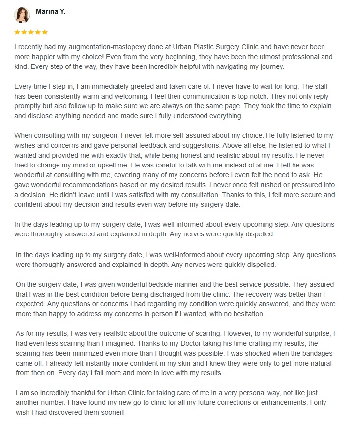 I recently had my augmentation-mastopexy done at Urban Plastic Surgery Clinic and have never been more happier with my choice! Even from the very beginning, they have been the utmost professional and kind. Every step of the way, they have been incredibly helpful with navigating my journey.